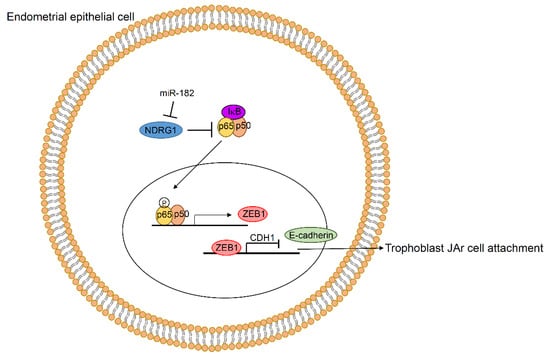 Proposed developmental mechanism for endometrial receptivity disorders, based on miR-182-5p-mediated downregulation of the NDRG1/NF-κΒ/ZEB1/E-cadherin pathway.