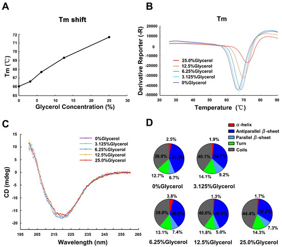 Thermal stability and secondary structural characteristics of Gal-7 in glycerol solutions. (A) Thermal shift assay. Tm shift when Gal-7 is incubated with different concentrations of glycerol. (B) Glycerol increases the melting temperature of Gal-7, indicating that glycerol can bind to Gal-7 and stabilize the structure of Gal-7. (C) CD assay. Profiles of CD spectrum of Gal-7 in glycerol solutions. The first negative derivative of the curve and CD spectrum of Gal-7 in 0%, 3.125%, 6.25%, 12.5%, and 25% glycerol are labeled purple, cyan, blue, yellow, and red, respectively. (D) Secondary structure content of human Gal-7 incubation with different concentrations of glycerol. The secondary structure content is shown as a percentage (%).