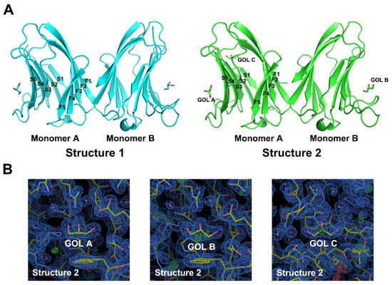 The two refined structures, structure 1 (homodimeric Gal-7 binds two glycerol molecules) and structure 2 (homodimeric Gal-7 binds three glycerol molecules), were crystallized using two different conditions, one at a relatively low concentration of PEG3350 (12%) and the other at a higher concentration (20%). As with all other galectins, structures 1 and 2 adopt the typical “jelly-roll” fold formed by sandwiching two anti-parallel β-sheets that consist of six (S1-S5) and five (F1–F5) β-strands and a short α-helix connecting strands S2 and F5 at 1.8 Å and 2.0 Å resolution, respectively. (Figure 3A). Our Gal-7 in complex glycerols as dimers in the P212121 space group is the same as previously reported for Gal-7 [21]. Structural statistics for Gal-7 in complex glycerols are provided in Table 1. Homodimeric Gal-7 binds three glycerol molecules at its two carbohydrate recognition binding sites (GOL A and GOL B) and the new binding pocket formed by its N-terminal and loop connecting strands S2 and F1 (GOL C), respectively. We found that electron density contour profiles for the three glycerol molecules were different in their crystal structure. Even though we were able to refine these glycerol molecules in the carbohydrate-binding sites and the binding pocket of the two monomers (Figure 3B), their different electron densities may be an effect that arises from crystal packing. The clear electron density map for the glycerol in its binding pocket reflects the molecular mechanism of Gal-7 binding to glycerol. The result of the co-crystal structure of Gal-7 and glycerol is the most likely direct evidence for the binding of Gal-7 to glycerol.