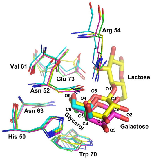 The carbohydrate binding sites of Gal-7 are merged. The residues of ligand-binding sites from structure 1, structure 2, and Gal-7 in complex with galactose (PDB: 2GAL) and Gal-7 in complex with lactose (PDB: 4GAL) are labeled by cyan, green, magenta and yellow, respectively. The positions of residues (His 50, Asn 52, Arg 54, Val 61, Asn 63, Trp 70 and Glu 73) could coordinate with glycerol and lactose. The C and O atoms of glycerol occupy similar sites as C4, C5, C6 and O4, O5, and O6 of galactose.