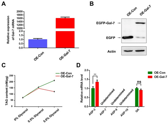 Glycerol can be the backbone of TAG. Several processes and many intermediate materials are implicated in TAG formation. AQPs are membrane proteins that act as channels for the transport of glycerol and other small solutes (including water, lactate and purines) across the membrane. Enzymes are needed in promoting the catalytic reaction chain to fulfill the TAG production. Several enzymes were involved in glycerol metabolism and lipid generation, such as glycerol kinase (GK), which turned glycerol into glycerol-3-phosphate (G3P) [22,23]. We have discovered that intracellular TAG is markedly reduced after overexpression of Gal-7; we next measured the AQPs and GK mRNA levels in HeLa cells to see whether Gal-7 is necessary for maintaining glycerol metabolism. As shown in Figure 6D, the AQP-3 levels in OE-Gal-7 cells were remarkably higher than the OE-Con cells but not GK and other AQPs. Increased AQP-3 levels favor cellular uptake of glycerol; however, the GK content is unchanged. It will cause glycerol molecules to accumulate in the cell and cause damage to the cells. According to these results, we speculated that overexpression of Gal-7 increased glycerol uptake but inhibited TAG formation. The accumulation of intracellular glycerol in OE-Gal-7 cells may cause cell damage and cause cells to be more sensitive to a variety of apoptotic stimuli.