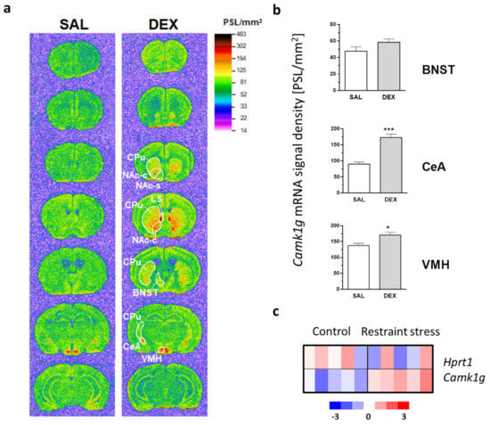 The animals were sacrificed 4 h after the i.p. injection with 16 mg/kg dexamethasone phosphate (DEX; Dexaven, JELFA S.A., Jelenia Góra, Poland) or saline. After sacrifice, the brains were removed and frozen on dry ice. They were then cut into 12 μm thick coronal sections on a cryostat microtome CM 3050S (Leica Microsystems, Nussloch, Germany), and the sections were thaw-mounted on gelatin-chrome alum-coated slides and processed for in situ hybridization. The hybridization procedure was performed as previously described []. Briefly, the sections were fixed with 4% paraformaldehyde, washed in PBS and acetylated by incubation with 0.25% acetic anhydrite (in 0.1 M triethanolamine and 0.9% sodium chloride). The sections were dehydrated using increasing concentrations of ethanol (70 to 100%), treated with chloroform for 5 min and rehydrated with decreasing concentrations of ethanol. The sections were hybridized for 15 h at 37 °C with an oligonucleotide probe complementary to Camk1g cDNA (cggtgcagggctgtgtttccatcaatccaggggtgtctgagggc; accession No.: NM_144817.2). The probes were labeled with 35S-dATP (Hartmann Analytic, Braunschweig, Germany) by the 3’-tailing reaction using terminal transferase (MBI Fermentas, Vilnius, Lithuania). After hybridization, the slices were washed three times for 20 min with 1 × SSC (0.15 M sodium chloride, 0.015 M sodium citrate)/50% formamide at 40 °C and twice for 50 min with 1 × SSC at room temperature. Then, the slices were dried and exposed to phosphorimager plates (Fujifilm, Tokyo, Japan). The hybridization signal was digitized using a Fujifilm BAS-5000 phosphorimager and Image Reader software (Fujifilm). Where appropriate, the ISH signal was quantified using the MCID Elite system (Imaging Research, St. Catharines, Ontario, Canada). Mean signal density, expressed in photostimulated luminescence units/mm2, was measured in selected brain regions. The background signal was measured over the corpus callosum and was subtracted from the hybridization signal in the regions of interest.