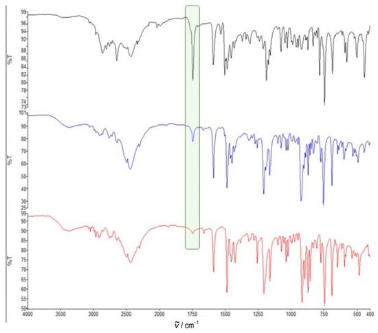 Monitoring of mechanochemical reaction of quinuclidin-3-one hydrochloride and O-phenylhydroxylamine hydrochloride with potassium carbonate (product 4·HCl) by ATR spectroscopy of the crude reaction mixture (black, 1 min, blue, 3 min, red, 6 min). Carbonyl peaks at 1750 cm−1 are highlighted with a green rectangle.