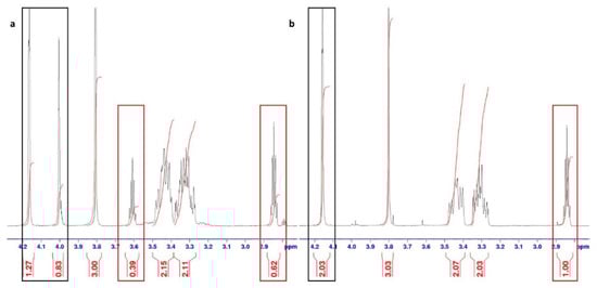 Part of the 1H NMR spectrum showing (a) mixture of (E/Z) isomers of compound 1·HCl, and (b) pure (E) isomer of product 1·HCl. Red rectangles indicate the signals for the proton H4, and black rectangles the signals for the H2 protons of the quinuclidine ring.
