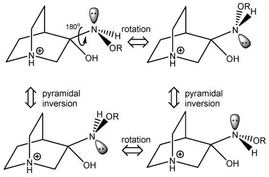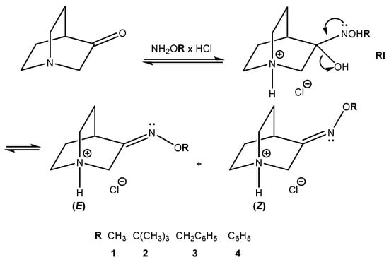 Mechanisms of the studied reaction for the synthesis of hydrochlorides of O-substituted quinuclidin-3-one oximes 1–4 are depicted in Figure 5. Upon addition of O-substituted hydroxylamine to the carbonyl group, an unstable reaction intermediate (RI) is formed. Elimination of the protonated hydroxyl group results in the formation of hydrochloride salts of (E)- and (Z)-stereoisomers (fast reaction step). In acidic conditions, the protonation of the nitrogen atom follows with the transfer of the proton via an explicit water molecule to the hydroxyl group [,].