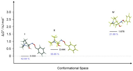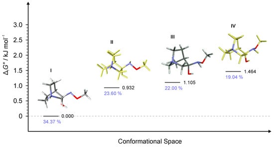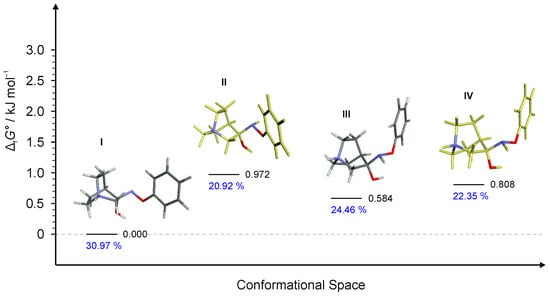 Four lowest energy conformers of RI4 and their relative standards Gibbs energies of formation ΔfG°calculated at the B3LYP-D3/6-311++G(d,p) level of the theory. (Relative fractions according to Boltzmann distribution at 298.15 K are given in blue.)