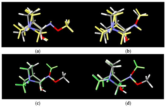 To explain the existence of two obtained stereoisomers in chemical syntheses, full conformational analyses of the reaction intermediates RI1–RI4 (Figure 5) were performed. Full conformational spaces for all intermediates were determined by the systematic scan of the potential energy surface spanned in all possible torsional degrees of freedom (Figure 7, Figure 8, Figure 9, Figure 10 and Figure 11). The goal of each conformational analysis was to confirm that those conformers can lead to synthesized products in chemical reactions. Then, using the different standard Gibbs energies of formation for the intermediate conformers, it was possible to estimate the stereoselectivity of products. These findings were compared with experimental data and those calculated from standard Gibbs energies of formation for stereoisomers of hydrochlorides 1–4 (Table 4).