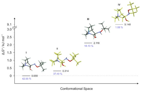 For RI1, a total of 12 conformers were found but only four of them (Figure 7) were energetically relevant (others were too high in energy and their relative content was close to zero). These four conformers can be divided into two groups of polytopes with the only difference between them being the configuration of the amino group. In addition, these two groups of polytopes were found for all reaction intermediates RI2–RI4 (Figure 9, Figure 10 and Figure 11). The lowest energy polytope configuration in all cases lead to the (E)-products (conformers RI1-I and RI1-II), whereas the second one leads to the (Z)-products (conformers RI1-III and RI1-IV) (Figure 7). This belongs to a classic case of the Curtin–Hammett principle [].