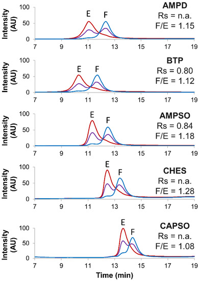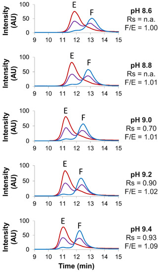 A mobile phase consisting of an AMPSO buffer was then screened at different pH (8.6–9.4, accounting for 0.2 pH unit intervals) to evaluate the impact of this parameter on separation quality. As reported in Figure 2, a slight decrease of retention time was observed when increasing the mobile-phase pH.