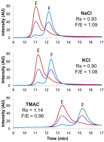 Then, three different salt types were screened as eluents for separating full and empty rAAV8 capsids. Figure 3 shows the corresponding chromatograms obtained by using the reference NaCl salt in comparison to those with KCl and TMAC in an AMPSO buffer (pH 9.4). Notably, although the full/empty ratios were not significantly impacted (ranging from 0.96 to 1.09), TMAC allowed a better resolution (Rs = 1.14) in comparison to that with the reference NaCl (Rs = 0.93). Finally, the optimized gradient conditions (AMPSO buffer pH 9.4 in combination with TMAC as eluent salt) were tested at three different mobile phase flow rates, namely 0.7, 0.3 and 0.1 mL/min. As illustrated in Figure S3, 0.3 mL/min was selected as the best compromise between chromatographic resolution, peak intensity and mobile phase consumption.