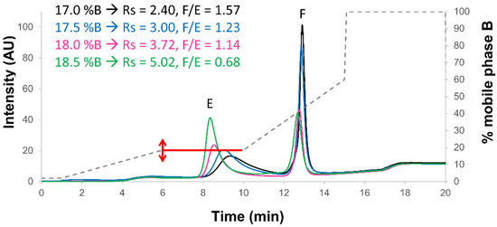 As described in Section 2.2, it remains difficult to improve selectivity between full and empty capsids simply by tuning the stationary phase and mobile phase under AEX conditions. Therefore, the gradient elution profile was optimized. Indeed, it is well known from the early days of chromatography that large proteins show a specific elution behavior under reversed phase liquid chromatography (RPLC) conditions, where the retention is extremely sensitive to mobile phase composition [27,28]. This particular retention behavior has been described as on/off or bind and elute mechanism, and can be explained as follows: the retention of a large solute is nearly infinite in a weak eluent (this corresponds to the “on” or “bind” state, where the protein species are fully adsorbed at the column inlet), while only a limited increase in eluent strength results in a huge retention decrease (this corresponds to the “off” or “elute” state, as the protein migrates towards the column outlet without any further interactions). In practice, we have recently developed a strategy combining isocratic steps and very short steep gradient segments at protein elution composition, to tune selectivity as desired [29,30]. This strategy was successfully applied to monoclonal antibodies in replacement of linear gradients, even if the latter are often more robust and easier to transfer. To the best of our knowledge, this innovative strategy has only been applied once in AEX for the separation of empty and full capsids of recombinant adeno-associated viruses, and the authors of this work named their strategy “modular discontinuous gradient” [22]. In the present work, this “step gradient approach” was evaluated to improve the separation of full and empty rAAV8 capsids. However, to easily obtain the final step gradient conditions, while avoiding a tedious trial-and-error method development approach, we used the HPLC modeling software DryLab. Based on two initial AEX gradients from 0 to 60% B in 15 and 45 min and the measurement of retention times for the two species, the software was able to establish the retention models of rAAV species and simulate any type of gradient, including potential isocratic steps at a given ionic strength. For the rAAV8 sample, DryLab modeled the following gradient: 2% B held at the beginning of the gradient for 1 min. Then, the gradient increased from 2% to 17.5% B in 5 min, the isocratic step held for 4 min, and then gradient was increased from 17.5% to 60% B in 5 min. Finally, we added a washing step at 100% B for 5 min and an equilibration step of the column at 2% B for 5 min. The optimal conditions suggested by DryLab were experimentally verified, but various isocratic hold compositions around the optimal value were tested (i.e., 17%, 17.5%, 18% and 18.5% B). The corresponding chromatograms were reported in Figure 4. As expected, the complete separation of full and empty rAAV8 peaks was obtained whatever the isocratic step composition. To assess the best conditions, two main figures of merit were evaluated in Figure 4, namely the full/empty ratio and the chromatographic resolution.