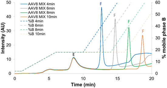 Optimization of the isocratic step duration. Mixture of full and empty rAAV8 capsids analyzed in AEX mode by using the AMPSO buffer pH 9.4 in combination with TMAC as eluent salt and the step gradient elution mode including an isocratic step hold at 18% B for 4 (blue line), 6 (grey line), 8 (green line) and 10 (orange line) minutes. Acronyms legend: E = empty rAAV8 capsid, F = full rAAV8 capsid.