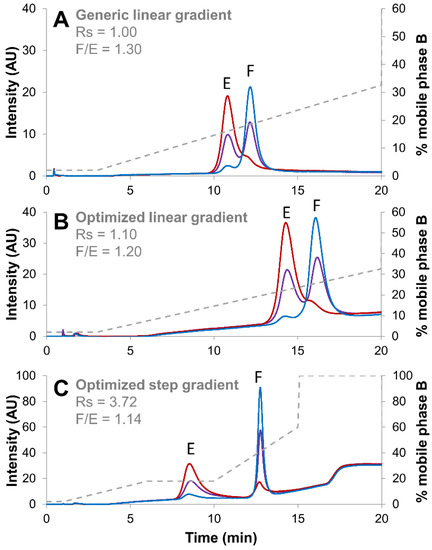 When isocratic step duration was too long, a decrease in the peak intensity and peak area corresponding to the full species was observed, while the peak corresponding to empty species was absolutely not affected (Figure 5). This implies that the full species were improperly eluted during the long isocratic step, leading to quantitative loss of these species. This result was reflected by an incorrect full/empty ratio (value too low) after a long isocratic step. Thus, the 4 min isocratic step was selected to avoid this phenomenon. It is also important to notice that a shorter isocratic step was not tested, as we need to maintain a sufficient resolution between the two species. Following the optimization of step gradient conditions, a systematic comparison was conducted between the generic method (Figure 6A), the optimized linear gradient (Figure 6B) and the optimized step gradient method (Figure 6C).