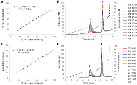 For this part of the work, 11 mixtures with both full and empty capsids co-mixed in different percentages (ranging from 0 to 100% of full capsids) in PBS buffer were analyzed. Figure 7 shows the corresponding chromatograms of all co-mixtures, with 0:100 and 100:0 empty/full sample corresponding to the pure full and empty capsids, respectively. As shown in the chromatograms, the full capsids sample from Virovek already contained about 10% of empty capsids, while this value dropped to only 1–2% for the Sirion Biotech rAAV8. On the other hand, the empty capsid samples from the two providers already contained more than 14% of full capsids. In Figure 7, we have also graphically represented the experimental vs. theoretical percentages of full rAAV8 capsids in the mixtures. The experimental values were exclusively obtained from the peak areas. As illustrated, a linear change in the peak area of both peaks (the R2 values were higher than 0.995 for the two different samples), with corresponding changes in percent peak areas of empty and full rAAV8 capsids, was monitored. These observations demonstrated that the area of each peak was additive, linear and specific to the empty and full rAAV8 capsids. This confirms that the developed method has the potential to be used in a QC environment, as it is precise, linear and sufficiently robust.