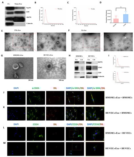 Characterization of exosomes isolated from myometrial tissue, HMSMCs and HUVECs. (A) Western blotting for Tsg101, CD9, HSP70, and Calnexin in cell lysis (CL) and myometrial tissue exosomes (Tissue-Exo). (B,C) Nanoparticle tracking analysis (NTA) measurements showing the size distribution of exosomes in term non-labor (TNL) and term labor (TL) myometrial exosomes. (D) Concentrations of exosomes derived from TNL and TL myometrial tissues had no significantly difference (p > 0.05). (E–G) TEM showing round/cup-shaped exosomes in the myometrial, HMSMC, and HUVEC exosomes. (H) Western blotting for HSP70, CD63, CD9, and Calnexin in the HMSMC and HUVEC exosomes. (I) NTA showing the size distribution of HMSMC and HUVEC exosomes. (J–M) Absorbing of Dil-labelled HMSMC and HUVEC exosomes inside the cells. DAPI was used to stain nuclear and α-SMA/CD34 were used to stain HMSMCs/HUVECs, respectively. Exo, exosomes. ns, not significant.