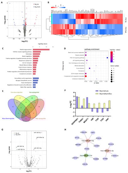 MicroRNA and proteomic profiles of exosomes in term non-labor and term labor myometrium. (A) Volcano plots for TNL (n = 2) vs. TL (n = 2) women. Significantly upregulated and downregulated proteins (adjusted p < 0.05) with a log2 fold change (FC) ±0.58 are represented by red and blue dots, respectively. Differentially expressed proteins that did not reach statistical significance are represented by gray dots. (B) Hierarchical clustering analysis of the screened DE proteins in the myometrium-derived exosome. (C) Bar diagram of the biology progress GO term clusters of DE proteins. (D) Bubble diagram of significantly enriched pathways for DE proteins. (E) Venn diagram of the DE gene set identified in exosome and tissue proteome. (F) Histogram of overlapping DE protein in the exosome and tissue. (G) Volcano plots for DE miRNAs of myometrial tissue exosomes in TNL and TL women. (H) Network of 2 upregulated miRNAs (hsa-miR-203a-3p and hsa-miR-205-5p) and 1 downregulated miRNA (hsa-miR-363-3p) and its target gene. Myo, myometrium.
