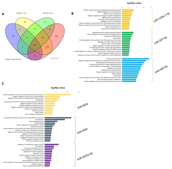 To explore the miRNAs specifically secreted by the HMSMCs and HUVECs, we compared the four groups of miRNA-seq data from the exosomes derived from the myometrium, HMSMCs, HUVECs, and female blood. The results revealed 156 miRNAs were specifically produced by HMSMCs (Figure 3A and Supplemental Table S5), of which the top three with the highest expression levels, miR-125b-1-3p, miR-337-5p, and miR-503-5p, showed their targets enriched the biological processes involved in transcriptional regulation, protein modification, and cellular responses (Figure 3B and Supplemental Table S6). Additionally, there were 48 miRNAs that were specifically secreted by HUVECs (Figure 3A and Supplemental Table S5), the top three with the highest expression levels, miR-663a, miR-4463, and miR-3622a-5p, were mainly related to the functions of actin cytoskeleton organization, cell proliferation, and apoptosis, metabolism, and oxidative stress (Figure 3C and Supplemental Table S7). These results indicate that the cargo of the exosomes from different myometrial cells were different, and these specifically secreted miRNAs might be key molecules that participate in the regulation of myometrial functions, which need further investigation.