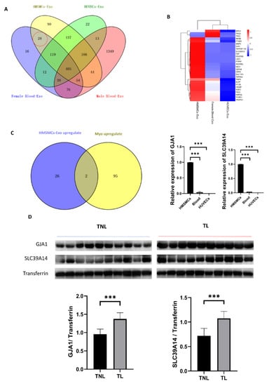 Myometrial contraction-specific biomarkers among exosomal proteins. (A) Venn diagram of miRNAs identified in HMSMC, HUVEC, and female blood- and male blood-Exo. (B) Heatmaps of the expression of the proteins identified in HMSMC, HUVEC, and female blood-Exo. (C) Venn diagram of proteins upregulated in HMSMCs-Exo and laboring myometrium, and GJA1 as well as SLC39A14 are the only two overlapping proteins and confirmed using qPCR. (D) GJA1 and SLC39A14 were upregulated in the peripheral blood of TL women; n = 10. *** p < 0.001.