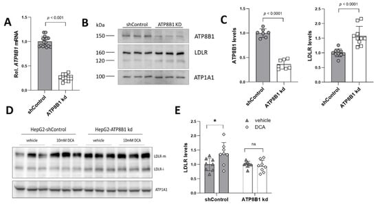 ATP8B1 knockdown coincides with increased LDLR expression. (A) ATP8B1 mRNA expression in ATP8B1 knockdown HepG2 cells. Data were normalized to shControl cells and are expressed as means +/− s.e.m. of 16 replicates from 5 independent experiments. Statistical analysis by an unpaired t-test.; (B) LDLR protein levels are increased in ATP8B1 kd HepG2 cells. Western blot of total cell lysates from a representative experiment is shown. ATP1A1 is included as a transfer control; (C) Densitometric analysis of ATP8B1 and LDLR levels. Data are expressed as relative mean protein levels normalized to ATP1A1 ± standard deviation of 7–10 replicates from 2–3 independent experiments. Statistical analysis by an unpaired t-test; (D) Representative Western blot of total cell lysates showing the effect of DCA (10 mM, 48 h) on LDLR levels. LDLR-m, mature form of LDLR; LDLR-I, immature form of LDLR; (E) Quantification of LDLR protein levels after DCA challenge. Data were normalized to the vehicle control of each cell line and are expressed as means +/− s.d. of 8 replicates from 3 independent experiments. Statistical analysis by a multiple paired t-test; * p < 0.05; ns, not significant.