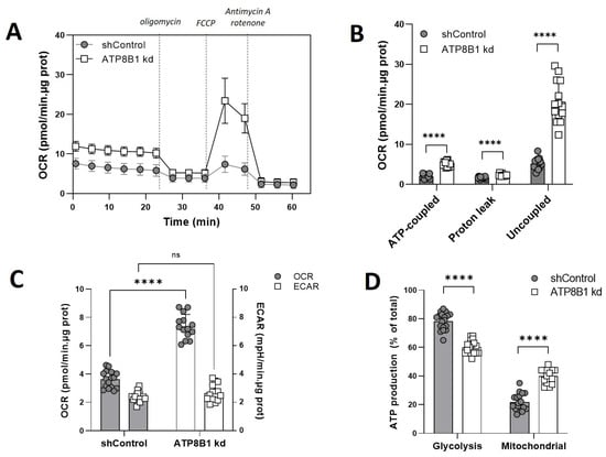 ATP8B1 knockdown coincides with increased mitochondrial OXPHOS. (A) Cells were incubated with 5.5 mM glucose and the oxygen consumption rate (OCR) was measured in a Seahorse analyzer. Dotted lines indicate the addition of different compounds to modulate mitochondrial respiration. Profiles shown are means +/− s.d. of 14–17 replicates of 2 independent experiments; (B) Quantification of ATP-coupled-, leak-associated and uncoupled OCR in the presence of glucose. Data are extracted from the data shown in (A), corrected for the non-mitochondrial OCR, and are expressed as means +/− s.d. of 14–17 replicates of 2 independent experiments; **** p < 0.0001 by multiple unpaired t-test; (C) Basal OCR compared to basal ECAR. Data are expressed as means +/− s.d. of 13–16 replicates from 2 independent experiments; **** p < 0.0001 by 2way ANOVA with Bonferroni’s correction for multiple testing; ns, not significant; (D) Estimated ATP production rate (in pmol/min.well) was calculated as described in M&M and is expressed as mean percentage of total ATP production +/− s.d. of 17–18 replicates from 2 independent experiments. **** p < 0.0001 by multiple unpaired t-test.