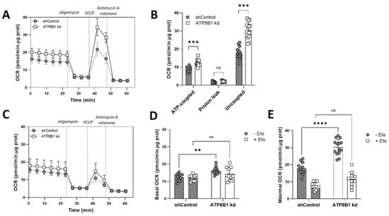 ATP8B1 knockdown coincides with an increased mitochondrial ß-oxidation. (A) Oxygen consumption rate (OCR) in the absence of added substrate. Profiles shown are means +/− s.d. of 12–14 replicates of 2 independent experiments; (B) Quantification of ATP-coupled-, leak-associated and uncoupled OCR when no substrate was added. Data are extracted from the data shown in (A), corrected for non-mitochondrial OCR, and are expressed as means +/− s.d.; *** p < 0.0001 by multiple unpaired t-test; (C) Oxygen consumption rate (OCR) in the absence of added substrate with 3 µM etomoxir. Profiles shown are means +/− s.d. of 12–14 replicates of 2 independent experiments; (D,E) Quantification of basal (D) and maximal (E) respiration (corrected for non-mitochondrial respiration) in the absence of added substrate with/without etomoxir (Eto). Data are expressed as means +/− s.d. of 11–14 replicates from 2 independent experiments. **** p < 0.0001, ** p < 0.005 by 2way ANOVA with Tukey’s correction for multiple testing; ns, not significant.