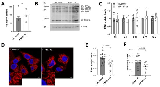 To obtain a mechanistic explanation for increased OXPHOS utilization in ATP8B1 knockdown cells, we studied mitochondrial mass, fragmentation and lipid composition. Genomic PCR analysis of the mtDNA coding for NADH-ubiquinone oxidoreductase chain 1 (complex 1 subunit) as well as Western analysis of electron transport chain complex I-V protein markers showed no significant differences between control and ATP8B1 knockdown cells (Figure 4A–C), indicating no difference in mitochondrial mass. Immunofluorescent detection of the mitochondrial outer membrane-localized protein TOM20 suggested that ATP8B1 knockdown cells had a more fragmented mitochondrial network (Figure 4D). Indeed, quantification of the mitochondrial area demonstrated that the mitochondria from the knockdown cells were smaller, even after correction for cell swelling (Figure 4E,F).