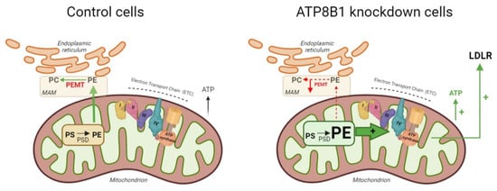 Hypothetical model summarizing the findings described. In mitochondria of control cells (left), phosphatidylserine (PS) is converted to phosphatidylethanolamine (PE) by phosphatidylserine decarboxylase (PSD). PE translocates to the mitochondrial-associated membrane (MAM), where phosphatidylethanolamine methyltransferase (PEMT) catalyzes the conversion of PE to PC. In ATP8B1 knockdown cells (right), PEMT is down-regulated, which leads to elevated mitochondrial PE levels that activate the protein complexes I–IV (IV = ATP synthase) of the electron transport chain (ETC) resulting in elevated OXPHOS and consequent increased ATP production and LDLR expression. Figure was created in BioRender.com.
