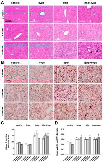 Increased hepatic lipid accumulation under lithogenic diet in female C57BL/6J mice. (A) Representative HE stainings reveal bright plasmatic cells (arrows) under litho and litho+hypo conditions indicating lipid accumulation (scale bar = 200 µm), n = 6–8/condition. (B) Increase in hepatic lipid content (arrows) in litho and litho+hypo mice determined by Oil Red O staining (scale bar = 20 µm). (C) Oil Red O staining quantification, n = 4/condition. (D) Increased wet liver weight (g/BW) under hypo, litho and litho+hypo conditions as compared to control, n = 6–8/condition. Data are represented as mean ± SEM, one-way ANOVA followed by Bonferroni post hoc analysis, * p < 0.05, ** p < 0.01, *** p < 0.001, # p < 0.0001.