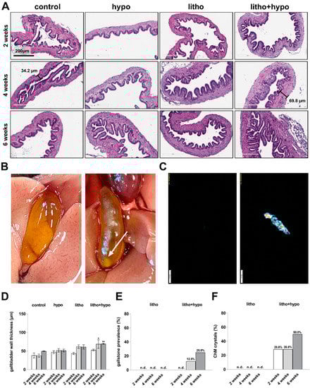 After four and six weeks increased gallbladder wall thickness under litho+hypo condition was observed (Figure 2A,D). Accordingly, 12.5% and 25% of mice under litho+hypo condition developed cholesterol gallstones. No cholesterol gallstone formation was observed in mice under control, hypo, and litho conditions (Figure 2B,E). Biliary cholesterol monohydrate (ChM) crystal formation was microscopically visible in 28.6% and 50% of mice under litho+hypo conditions at two, four, and six weeks, respectively, whereas neither control, hypo nor litho conditions revealed biliary ChM crystals (Figure 2C,F).