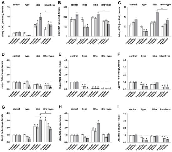 Biliary cholesterol supersaturation accompanied by a biliary imbalance of cholesterol, bile acids, and phospholipids is thought to be the main cause of cholesterol gallstone formation []. Therefore, we investigated biliary concentrations of cholesterol, bile acids, and phosphatidylcholine, the main phospholipid, as well as the hepatic gene expression of the respective synthesis enzymes and canalicular transporters (Figure 3). Biliary total cholesterol concentration was increased in litho and litho+hypo conditions (Figure 3A). In addition, the litho+hypo condition resulted in reduced total cholesterol, total bile acid, and phosphatidylcholine concentrations after six weeks of treatment as compared to litho condition (Figure 3A–C). Hepatic gene expression of Hmgcr, Cyp7a1, and Cyp27a1, enzymes involved in cholesterol and bile acid synthesis, was downregulated in hypo, litho, and litho+hypo conditions (Figure 3D–F). Transcript levels of canalicular cholesterol transporter Abcg5 were increased in litho and litho+hypo conditions (Figure 3G), whereas canalicular bile acid transporter Bsep expression was elevated under litho conditions (Figure 3H). In contrast, phospholipid transporter Abcb4 was downregulated in the litho+hypo condition (Figure 3I). Under the hypo condition, reduced hepatic Abcg5, Bsep, and Abcb4 expression were observed (Figure 3G–I).