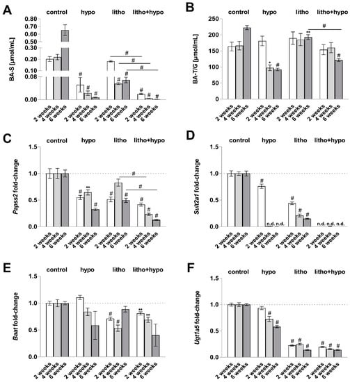 In addition to a biliary imbalance, diminished bile acid hydrophilicity may contribute to cholesterol gallstone formation []. The ratio of hydrophobic vs. hydrophilic bile acids revealed a decreased amount of hydrophilic primary bile acids under hypo and litho+hypo conditions compared to the control condition (Supplementary Figure S2). Bile acid solubility is facilitated by the conjugation of primary bile acids via hepatic detoxification phase II processes. Further analysis revealed diminished bile acid sulfate concentrations in hypo, litho and litho+hypo conditions, which was even more pronounced in litho+hypo as compared to litho conditions (Figure 4A). In addition, concentrations of glycine- and taurine-conjugated bile acids were reduced after six weeks of treatment under hypo, litho, and litho+hypo conditions (Figure 4B). The expression of Papss2 (sulfonation), Sult2a1 (sulfonation), Baat (amidation), and Ugt1b5 (glucuronidation) was diminished either in hypo and/or litho condition (Figure 4C–F).