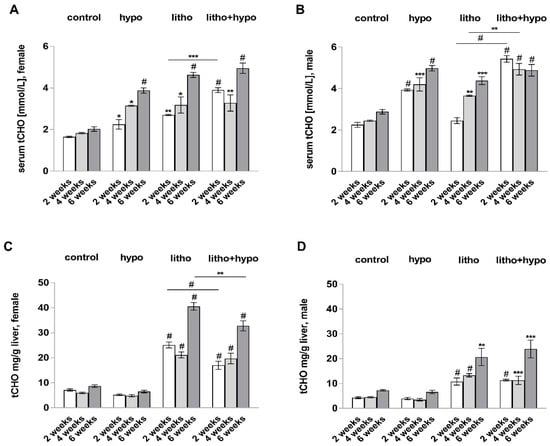 Thyroid hormone deficiency reduces hepatic cholesterol content in lithogenic diet-supplemented female but not male C57BL/6J mice. (A,B) Serum total cholesterol concentrations [mmol/L] in female and male mice with increased concentrations under hypo, litho, and litho+hypo conditions. (C,D) Hepatic total cholesterol contents [mg/g liver] in female and male mice. Increase in hepatic cholesterol content under litho and litho+hypo conditions. Reduced cholesterol content in litho+hypo as compared to litho condition in females. Data are represented as mean ± SEM, one-way ANOVA followed by Bonferroni post hoc analysis, * p < 0.05, ** p < 0.01, *** p < 0.001, # p < 0.0001, n.d.: not detected, n = 4–8/condition.