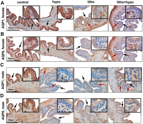 Gallbladder aquaporin expression and localization differ sex-dependently by thyroid hormone deficiency in C57BL/6J mice. Representative immunohistochemistry of aquaporin 1 (AQP1) and aquaporin 8 (AQP8) in gallbladder. (A,B) Diminished epithelial AQP1 and AQP8 expression (black arrows) and translocation of AQP1 from epithelial cells to subapical vesicles (red arrows) under litho and litho+hypo conditions. (C,D) Diminished epithelial AQP1 and AQP8 expression (black arrows) and translocation of AQP1 from epithelial cells to subapical vesicles (red arrows) under hypo, litho, and litho+hypo conditions. Scale bar = 100 μm, n = 4/condition.