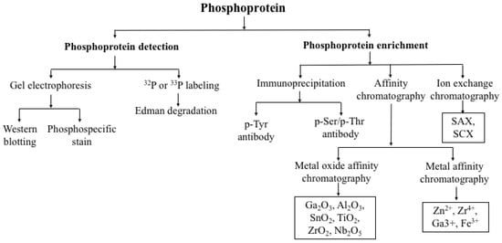 There are many methods of phosphoproteins detection or analysis. One is phosphoproteins enrichment by (i) immunoprecipitation using phosphoserine/phosphothreonine/phosphor-tyrosine antibody, (ii) affinity chromatography by (a) metal oxide like TiO2, Ge2O3, Al2O3 (b) immobilized metal affinity chromatography, and (iii) ion exchange (strong anion exchange/cation exchange) chromatography (Figure 1). Another method is gel electrophoresis, followed by phospho-specific stain (ProQ diamond) and western blotting by phospho-specific antibody. Another method is 32P labelling gel electrophoresis or Edman degradation. These methods are still valid today and are used routinely in studying phosphoproteomics. The above methods are coupled to MS analysis because of their sensitivity, versatility, and reproducibility. Another approach is separation of phosphoproteins by 2D gel electrophoresis and an additional enrichment procedure such as phospho-specific staining, IMAC or immune-affinity followed by MS analysis to identify phosphoproteins present in cellular extracts. The immune-affinity method towards enrichment is an important approach for the identification of phosphotyrosine residues, as they are less abundant than phosphoserine and phosphothreonine residues.