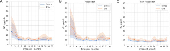 Timecourse of serum neurofilament light chain (sNfL) during alemtuzumab treatment in the whole cohort (A) in responders ((B), Months 15–36: No relapse activity, no MRI activity) and non-responders ((C), Months 15–36: Relapse activity and/or MRI activity), with 95% confidence intervals. The sNfL levels were measured using Ella and Simoa. (A: All patients (n = 42); (B) Responders (n = 29), (C): Non-responders (n = 13). Data time points are summarized quarterly.