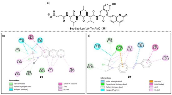 Reference compound structure Suc-Leu-Leu-Val-Tyr-AMC (26) is used as the positive control (a). The 2D poses of CTMAs 21 (b) and 22 (c), respectively, within the receptor pocket.