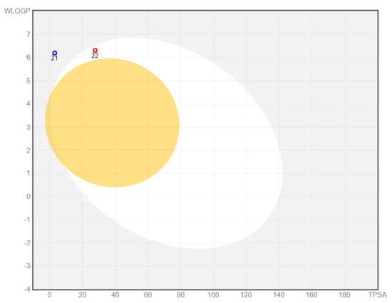 BOILED-Egg plot. Points located in the BOILED-Egg’s yolk (yellow) represent the molecules predicted to passively permeate through the blood-brain barrier, whereas the ones in the egg white are relative to the molecules predicted to be passively absorbed by the gastrointestinal tract; the blue dots (21) indicate the molecules for which it was expected to be effluated from the CNS by the P-glycoprotein, whereas the red ones (22) point to the molecules predicted not to be effluated from the CNS by the P-glycoprotein.