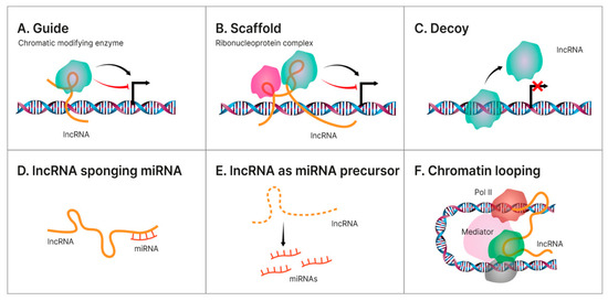 Different mechanisms of action for lncRNAs. Illustration of the main regulatory mechanism endorsed by hepatic lncRNAs in the pathology transition of NAFLD towards HCC. (A). Guide—some lncRNAs aid specific proteins to reach their target, thus accomplishing their biological functions. Oftentimes, some of these proteins are transcription factors located on specific DNA regions and this guidance becomes an indirect way of regulating gene transcription; (B). Scaffold—LncRNA can facilitate the interaction of numerous molecules and proteins, enabling the assembly of different macromolecular complexes, thus promoting the conjunction and integration of molecular information within different signaling pathways; (C). Decoy—some lncRNAs bind directly to some protein molecules impairing their functions; (D). lncRNA sponging miRNA—some lncRNAs can act as ceRNAs, or sponges, reducing their effect upon the target mRNA, thus regulating gene expression; (E). lncRNA as miRNA precursor—some lncRNAs can act as precursors of miRNAs to directly modulate their regulatory activity; (F). Chromatin looping—as lncRNAs are long and mobile, they could serve as bridges to drive the inter- or intra-chromosomal interactions.