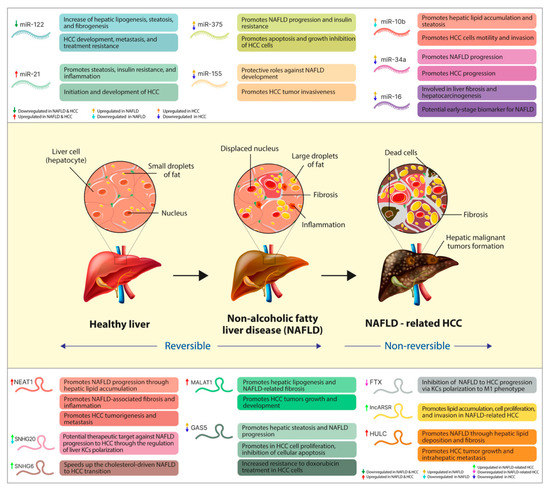 The pathologic transition of healthy liver towards NAFLD-related HCC, together with the main dysregulated ncRNAs and the disease-promoting processes they regulate. In the upper part of the figure, we illustrated the primary miRNAs and their expression pattern throughout the transition of NAFLD towards HCC, together with the pathological processes of which regulation they play a part in. Centrally, we summarize the main changes in the cellular and tissue architecture of the liver in both NAFLD (reversible) and NAFLD-related HCC (nonreversible). At the bottom, we presented the main lncRNAs involved in NAFLD transition towards HCC, their dysregulated expression level, and the main disease-promoting process in which they play a regulatory role.