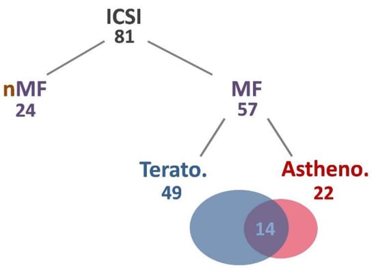Distribution of sperm samples. Numbers indicate the number of cases. Abbreviations: Astheno, asthenozoospermia; ICSI, intracytoplasmic sperm injection; MF, male factor; nMF, non-male factor; Terato, teratozoospermia.