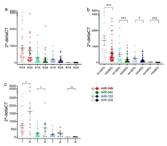 Relative expression levels of miRNAs in spermatozoa with differential morphology and motility. (a) Scatter plot showing sperm relative levels of miR-34b/c, miR-122, and miR-429 of each man in the K < 4 and K ≥ 4 groups. Kruger value (K) serves as a criterion for identifying sperm morphology. * p < 0.05. K < 4, n = 49; K ≥ 4, n = 32. (b) Scatter plot showing sperm relative levels of miR-34b/c, miR-122, and miR-429 for each individual in motility m < 40% and ≥40 groups. m < 40%, n = 22; m ≥ 40%, n = 59. * p < 0.05, *** p < 0.001. (c) Differential relative levels of miR-34b/c, miR-122, and miR-429 between spermatozoa from teratozoospermia-only (n = 35) and asthenozoospermia-only (n = 8) men. The data are shown as mean and SEM. A, asthenozoospermia; T, teratozoospermia. * p < 0.05, ** p < 0.01.