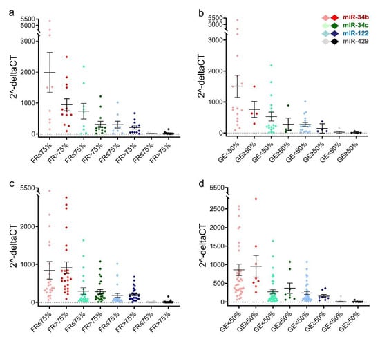 Relative levels of sperm miRNAs in different groups of egg fertilization rates and early embryonic development. Differences in relative levels of miRNAs: (a) asthenozoospermia sperm samples between egg fertilization rates >75% and ≤75%, (b) asthenozoospermia sperm samples between good-quality embryo rates ≥50% and <50%, (c) teratozoospermia sperm samples between egg fertilization rates >75% and ≤75%, and (d) teratozoospermia sperm samples between good-quality embryo rates ≥50% and <50%. The data are shown as mean and SEM. FR: fertilization rate; GE: good-quality embryo.