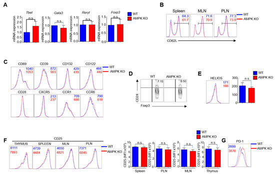 The phenotypes of young AMPKα1fl/fl Foxp3YFP-Cre (AMPK-KO) and Foxp3YFP-Cre (WT) mice were similar. (A) Detection of mRNA expression of the Tbet, Gata3, and Rorγt from CD4 and Foxp3 from regulatory T cells (Tregs) isolated from WT and AMPK-KO mice by real-time PCR. The data were normalized to Gapdh gene expression. (B) Flow cytometric analysis of CD62hiCD44lo percentage in CD4 isolated from WT and AMPK-KO mice. (C) MFI representatives of CD69, CD39, CD132, CD122, CD28, CXCR5, CCR1, and CCR6 in CD4 isolated from WT and AMPK-KO mice. (D) The percentage of immature and mature thymic Tregs in WT and AMPK-KO mice. (E) Flow cytometric analysis of the MFI of the helios in Tregs from WT and AMPK-KO mice. (F) Flow cytometric analysis and MFI representatives of CD25 in Tregs from the thymus, mesenteric lymph nodes (MLNs), peripheral lymph nodes (PLN), and spleen from WT and AMPK-KO mice. (G) MFI representation of the flow cytometric analysis of PD-1 in Tregs from the spleen of WT and AMPK-KO mice. n.s means non-significant (p > 0.05).
