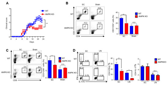 Several studies have described how AMPK activation can inhibit the inflammatory response, whereas decreased AMPK activity is associated with increased inflammation [15,16]. To determine the role of AMPK in Tregs in inflammation in young mice, we used the experimental autoimmune encephalomyelitis (EAE) model, a well-established mouse model for multiple sclerosis. Accordingly, EAE was induced in mice by immunization with the MOG35–55 peptide in CFA and pertussis toxin, as explained in Section 4.2. Interestingly, young AMPK-KO mice showed low disease severity, as indicated by decreased clinical scores (Figure 2A). Furthermore, we isolated the brain and spinal cord from EAE-induced WT and AMPK-KO mice and analyzed CD4+ and CD8+ T cell infiltration to evaluate immune cell infiltration in nervous tissues. CD4+ T and CD8+ T cells infiltrated the spinal cord of WT mice more than the spinal cord of AMPK-KO mice (Figure 2B,C), but not the brain tissues (Figure 2B,C). Previous studies have reported that Th1 and Th17 cells are critically involved in the pathogenesis of multiple sclerosis and its mouse model, EAE [17,18,19]. Therefore, we examined TH1 and TH17 cell infiltration by intracellular staining of mononuclear cells derived from the spinal cord and lymph nodes. Supporting the previous result, IFN-γ-specific Th1 cells significantly reduced in the spinal cord and lymph nodes of AMPK-KO mice (Figure 2D). Collectively, these findings indicate that AMPK-KO mice show less EAE than WT mice by reducing T cell infiltration in the spinal cord.