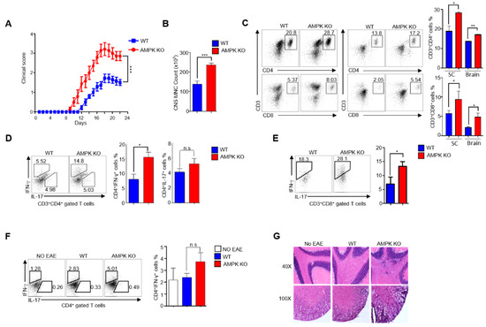 As we observed a less inflammatory phenotype in AMPK-KO mice, we then checked whether the aged mice (24–32 weeks) showed similar results. However, contrary to young mice, aged mice showed the opposite results. Monitoring EAE-induced mice revealed that aged WT mice showed less disease severity than AMPK-KO mice, as indicated by diminished clinical scores (Figure 3A). Additionally, the spinal cord was isolated and homogenized, and more mononuclear cellularity was observed in the AMPK-KO mice than that in the WT mice (Figure 3B). In addition, both WT and AMPK-KO mice showed substantial infiltration of CD4+ and CD8+ T cells. However, CD4+ and CD8+ T cell infiltration increased in the spinal cord and brain of AMPK-KO mice (Figure 3C). Pro-inflammatory cytokines play essential roles in EAE progression; therefore, we checked the presence of pro-inflammatory cytokines IFN-γ in CD4+ and CD8+ T cells and IL-17A in CD4+ T cells by intracellular staining of mononuclear cells derived from the spinal cord, brain, and spleen. IFN-γ+ CD4+ and IFN-γ+ CD8+ T cells increased in the AMPK-KO mice’s spinal cords (Figure 3D,E), but no significant difference was observed in IFN-γ+ CD4+ T cells in the spleen (Figure 3F) and IL-17A+ CD4+ T cells in both the spinal cord and spleen (Figure 3E,F) of the AMPK-KO mice than those in their WT counterparts. Moreover, histological analysis of the spinal cord revealed increased cellular infiltration in the histological sections of the AMPK-KO mice spinal cord (Figure 3G). Altogether, these findings revealed that AMPK-KO aged mice showed more severe EAE than the WT aged mice due to higher infiltration of T cells and pro-inflammatory cytokine IFN-γ in the spinal cord.