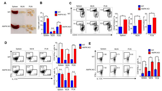 In AMPK-KO mice, EAE progression was more severe; therefore, we analyzed the phenotypes of aged WT and AMPK-KO mice to determine the phenotypic differences between these two groups of mice. We first examined the size of secondary lymphoid organs and found that AMPK-KO mice had a comparatively larger spleen and PLN (Figure 4A), as well as higher cellularity (Figure 4B) than WT mice. We then analyzed CD4+ T cells for the expression of homing receptors CD44 and CD62L to distinguish naive (CD44lo CD62Lhi) and effector memory (CD44hi CD62Llo) cells in the spleen, MLN, and PLN. Notably, the effector memory CD4+ T cells significantly increased in AMPK-KO mice (Figure 4C). These results suggest the development of an inflammatory phenotype in AMPK-KO mice. Therefore, we further investigated the inflammatory cytokines IFN-γ in CD4+ and CD8+ T cells and IL-17A in CD4+ T cells by isolating cells from the spleen, MLN, and PLN. Although the percentage of CD4+IL-17A+ cells was comparable between WT and AMPK-KO mice (Figure 4D), the percentage of CD4+IFN-γ+ and CD8+IFN-γ+ cells significantly increased in AMPK-KO mice (Figure 4D,E). Moreover, serum IgG1, IgE, and antibodies to double-stranded DNA concentrations were elevated, whereas the IgG and IgM levels were unchanged in AMPK-KO mice (Figure S2A,B). Altogether, these results suggest that AMPK-KO mice develop a more inflammatory phenotype over time than their WT counterparts.