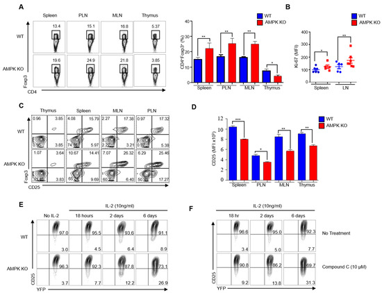 CD25 expression substantially decreased in regulatory T cells (Tregs) from AMPKα1fl/fl Foxp3YFP-Cre (AMPK-KO) mice with age. (A) Expression of Foxp3+ cells gated from CD4+ cells isolated from the spleen, peripheral lymph nodes (PLN), mesenteric lymph nodes (MLN), and thymus of Foxp3ypf-cre (WT) and AMPK-KO mice and the frequency of CD4+Foxp3+ cells in bar diagram in those mice (right). (B) Scatter plot representation of MFI of Treg proliferation from the spleen and lymph nodes of WT and AMPK-KO mice according to the Ki-67 protein expression analysis. (C) Expression of Foxp3+ CD25+ and Foxp3+ CD25− cells gated from CD4+ cells isolated from the thymus, spleen, MLN, and PLN of WT and AMPK-KO mice. (D) Bar diagram representation of the flow cytometric analysis of MFI of CD25+ cells gated from CD4+ cells isolated from the thymus, spleen, MLN, and PLN of WT and AMPK-KO mice. (E) Flow cytometric analysis of YFP+CD25+ cells gated from CD4+YFP+ cells after in vitro stimulation of Tregs sorted from WT and AMPK-KO mice and cultured for various time periods in the presence of only IL-2. (F) Flow cytometric analysis of YFP+CD25+ cells gated from CD4+YFP+ cells after in vitro IL-2 stimulation of Tregs sorted from WT mice and cultured for various time periods in the presence or absence of compound C. * p < 0.05, ** p < 0.01 and *** p < 0.001.