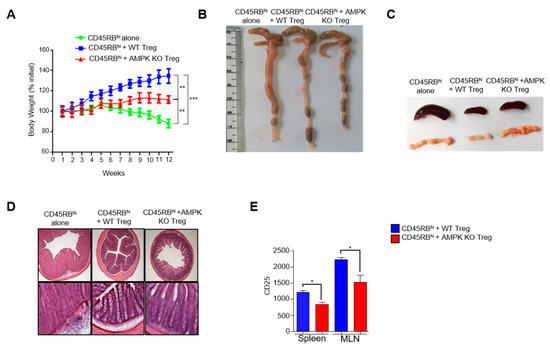To further examine whether AMPK is dispensable for Tregs to inhibit inflammation, we analyzed the ability of AMPK-deficient Tregs from aged mice to suppress CD45RBhi cell transfer-induced colitis in Rag−/− mice. Disease onset, such as body weight loss, was detected 5 weeks post-CD45RBhi cell transfer. However, co-transfer of AMPK-deficient Tregs failed to increase the body weight of colitis-induced mice as effectively as WT Tregs (Figure 6A). In addition, morphological changes were observed in the colon, spleen, and MLN. Compared to that in WT Treg-recipient mice, the colons shortened, and spleens and MLNs enlarged in AMPK-KO Treg-recipient mice (Figure 6B,C). Furthermore, histological analysis of the colon showed more inflammatory infiltrate, disrupted mucosa, and crypt architecture in AMPK-KO Treg-recipient mice than those in the WT Treg-recipient mice (Figure 6D). Finally, we tested CD25 expression in Tregs from the spleen and MLN and found that Tregs of both the spleen and MLN of mice co-transferred with AMPK-KO Tregs showed less CD25 expression (Figure 6E). Altogether, mice with T cell transfer colitis showed that AMPK-KO Tregs have less suppressive ability than WT Tregs, possibly because of the decreased CD25 expression.
