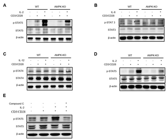 Previous studies have suggested that activated STAT5 translocates into the nucleus of cells to regulate target genes, including CD25 [21,22,23]. Therefore, we examined the expression of STAT5 and other STAT proteins by Western blotting. Western blot analysis revealed that the expression of phosphorylated STAT5 was reduced in Tregs of AMPK-KO mice after TCR and IL2 stimulation (Figure 7A). We also analyzed other STAT proteins, such as STAT3 (Figure 7B) and STAT4 (Figure 7C), but their expression levels were comparable. Moreover, we analyzed STAT5 expression in Tregs of aged mice and observed that p-STAT5 was greatly reduced in the Tregs of AMPK-KO mice (Figure 7D). Thereafter, we treated WT Tregs with compound C along with TCR and IL-2 stimulation for 18 h and found that the AMPK inhibitor compound C decreased p-STAT5 expression (Figure 7E). Overall, the data indicate the role of AMPK in STAT5 phosphorylation and CD25 maintenance in Tregs.