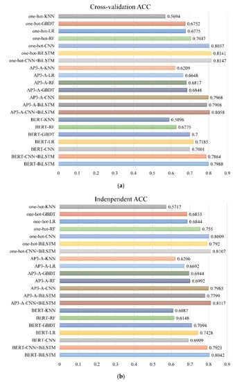 As can be seen from Figure 1, in the 5-fold cross-validation and independent test experiments, the three deep learning methods achieve higher accuracy compared with the traditional machine learning algorithms. For the sequence information encoded of one-hot coding, when CNN+BiLSTM combined model was used to learn features, the ACC value of cross validation reaches 81.47%, which is 1.10% higher than that of CNN model only and 0.06% higher than that of BiLSTM model only. For the physicochemical information of AP3-A coding, the ACC value of cross validation reached 80.58% when CNN+BiLSTM combined model was used to learn features, which was 0.90% and 1.50% higher than that of CNN model and BiLSTM model alone, respectively. This indicates that the combination model of CNN and BiLSTM can simultaneously extract the local information of amino acid residues and the order dependent relationship between different residues and obtain higher quality sequence features and physicochemical characteristics. However, we found that for the context information of peptides, only BiLSTM was used to learn features, which achieved the optimal result; its cross-validated ACC value was 9.87% higher than that of CNN model alone and 0.12% higher than that of CNN+BiLSTM model. This is because BERT uses the above and below of the target word to capture the context information of the sequence and fully reflect the global information of the sequence. While CNN uses the sliding window to form a specific scale matrix to capture features, which will weaken the context information extracted by BERT and even lead to losing part of the information in the process of noise reduction, reducing the prediction performance of the model []. BiLSTM can well capture the bidirectional semantic dependence, strengthen the context information extracted by BERT, to improve the prediction accuracy of peptide detectivity.
